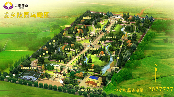 整个园区占地134余亩,全区由客户服务中心和殡葬超市、牌坊、金水桥、滴水观音、忠孝礼仪广场、功德坛及子母龙水系组成。公墓园区按照不同碑型,划分传统墓区、艺术墓区。园区环境优美,一年四季常绿,三季鲜花盛开,名贵树木花草点缀,自然景观和中西文化典型雕塑融为一体,成为中西文化的缩影;金水河贯穿园区,形成子母龙水系,加之地形自南向北逐渐升高,东西自然隆起,形成风水宝地。