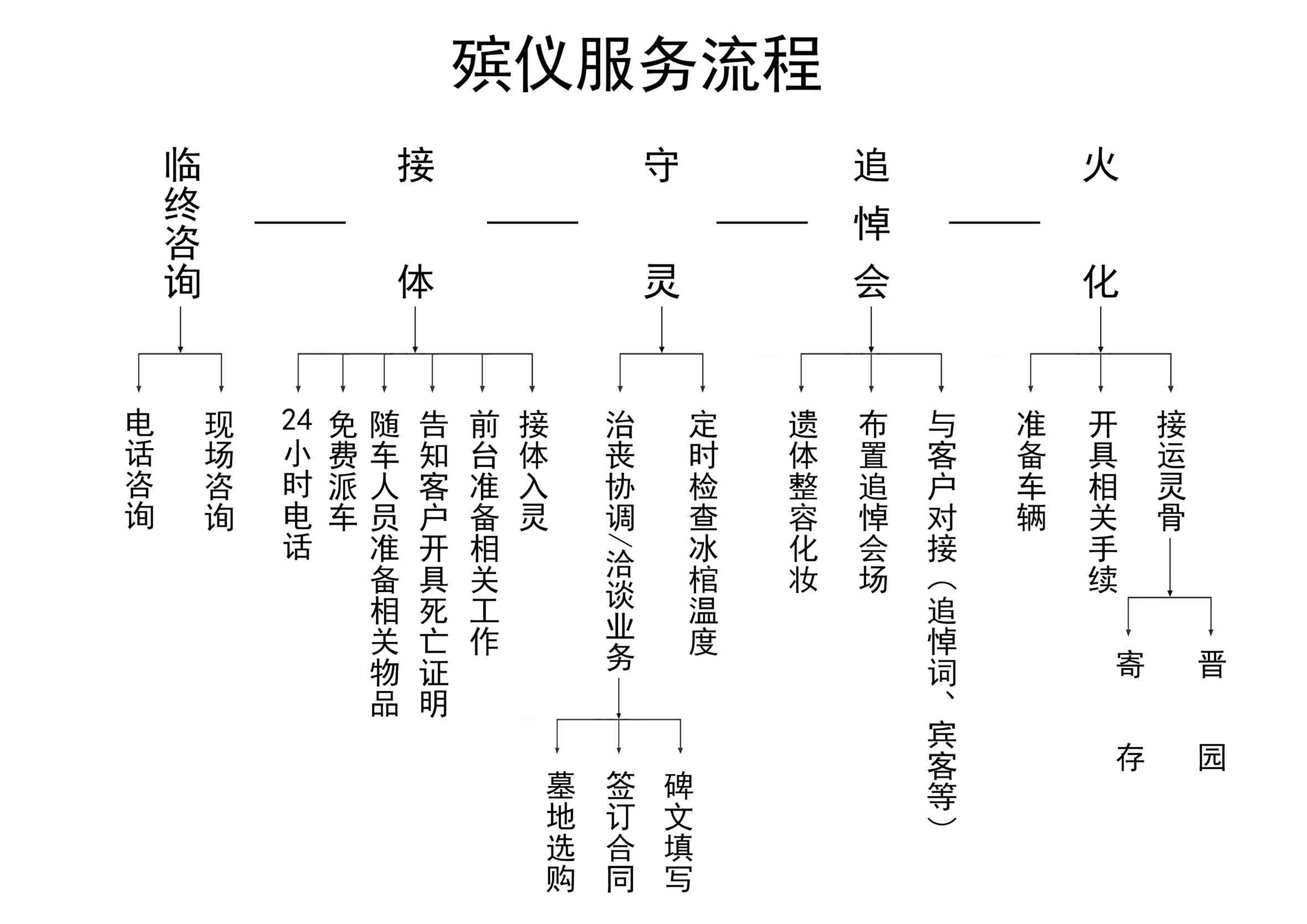 我单位拥有一支专业的殡仪服务团队,从临终咨询到接体、守灵、追悼会、火化、后续关怀等一系列项目,实行一站式管家服务,由礼仪师全程负责,给予客户无微不至的关怀,真正的让生命更具有尊严,使丧葬文化不再只有哭泣与无措。 服务项目主要有公墓销售,尊体接运,守灵追悼,火化,骨灰寄存,晋园安葬,客户用餐,提供寿衣、骨灰盒、花圈花篮、祭祀等殡葬用品,遗像制作,MV、幻灯片等制作,鲜花布置。本公司还可向客户提供供品、丧葬纸扎等用品的代办服务。